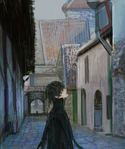 写真を参照しているんですが、晴れを雨にしていまいましたw石畳に惚れたんだ