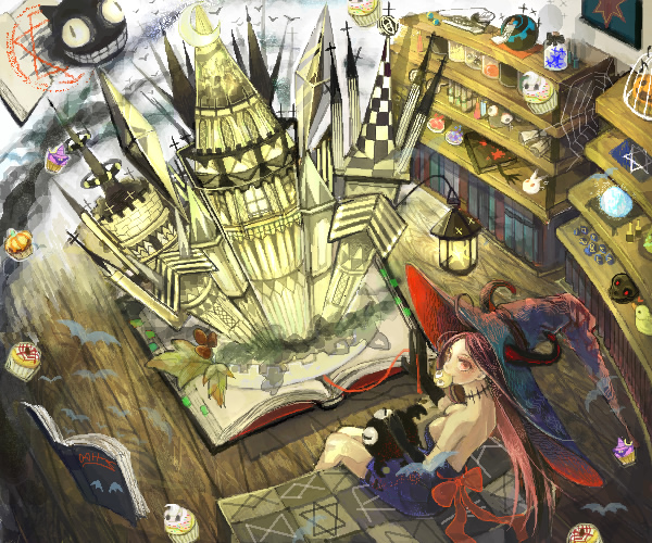 お礼絵として、一番上の絵にいる、本から出てくる猫の化け物と魔女さんにべったりしてる蝙蝠の化け物を擬人化して、魔女さんに絡ませた、須藤の欲望が漲ってる絵が、コレ↓