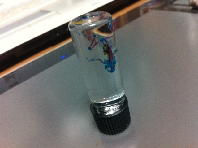 カエルの透明標本です。薬の影響で部位ごとに色分けで染色されてます。むちゃくちゃ綺麗です^^*あまりの指の骨の小ささにキュンvとくる←