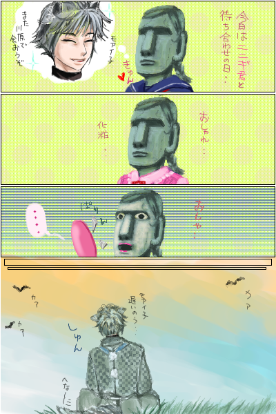 モアイ子さんとの後日談に反応いただけて、嬉しかったです>///<甘酸っぱい感じいいですよね。モアイ子さんの行動を考えると、どんどん微笑ましい方向にお話しが浮かんできます^v^*また、何か浮かんだら描いていきたいコンビです~。嬉しすぎるお祝いのお言葉もどうも有難うございましたー!!