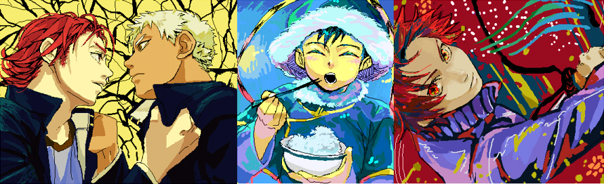 左から練習板で描いた辰と虎の擬人化、中央はシュトヘルよりユルール、右はオリジナル。